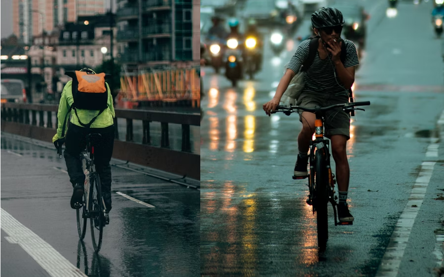 Het dragen van opvallende kleding kan helpen je zichtbaarheid op de weg flink te vergroten. Foto links: Joshua Lawrence on Unsplash. Foto rechts Sabda Rhamadhoni on Unsplash